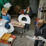 - Die Frauen schneiden und schmirgeln Styroporbuchstaben